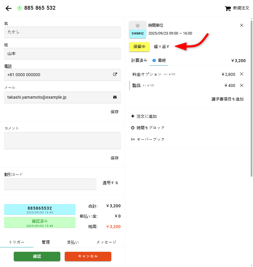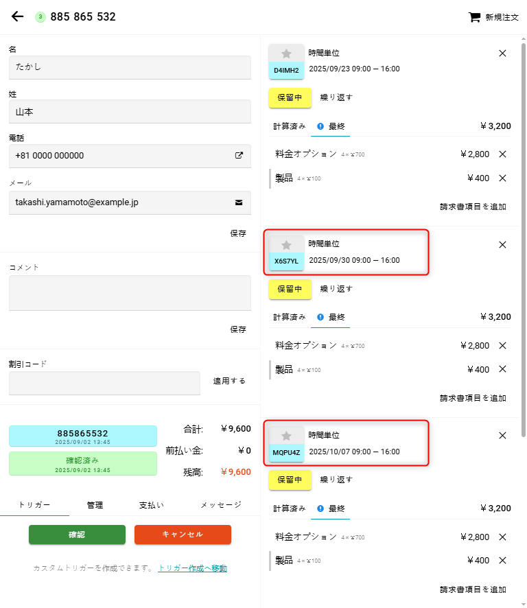 新しい予約はすぐに注文内に表示されます。 ご注意ください:予約を2回繰り返すと、注文内には合計3件の予約が作成されます。