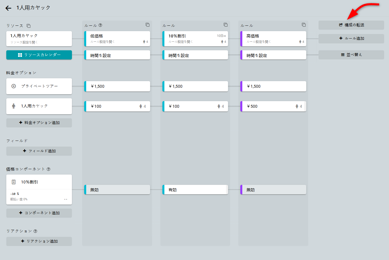 設定を転送するには、すでに希望する構成が設定されているリソースを開きます。 右上の構成の転送ボタンをクリックしてください。