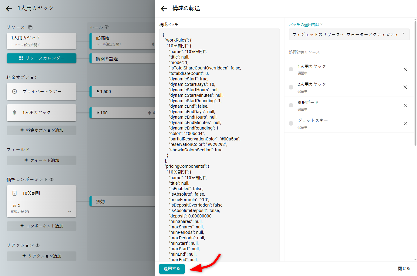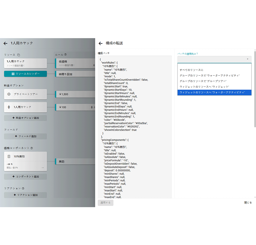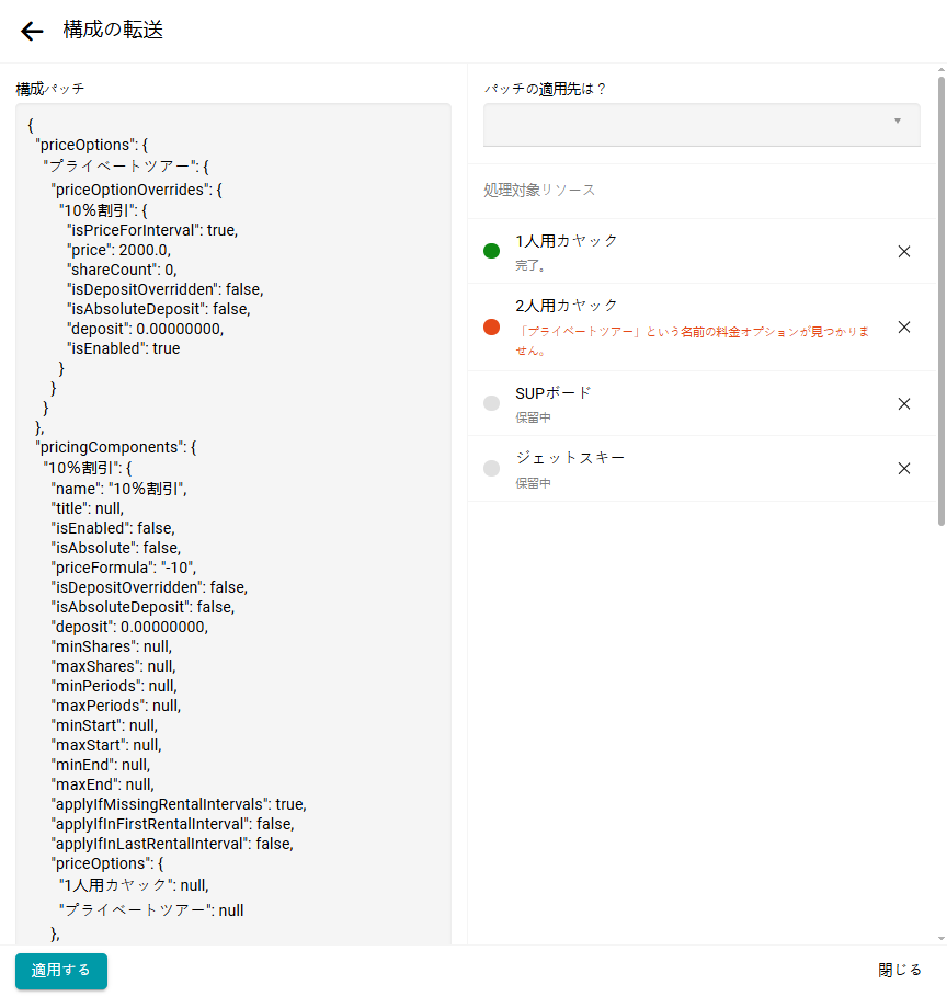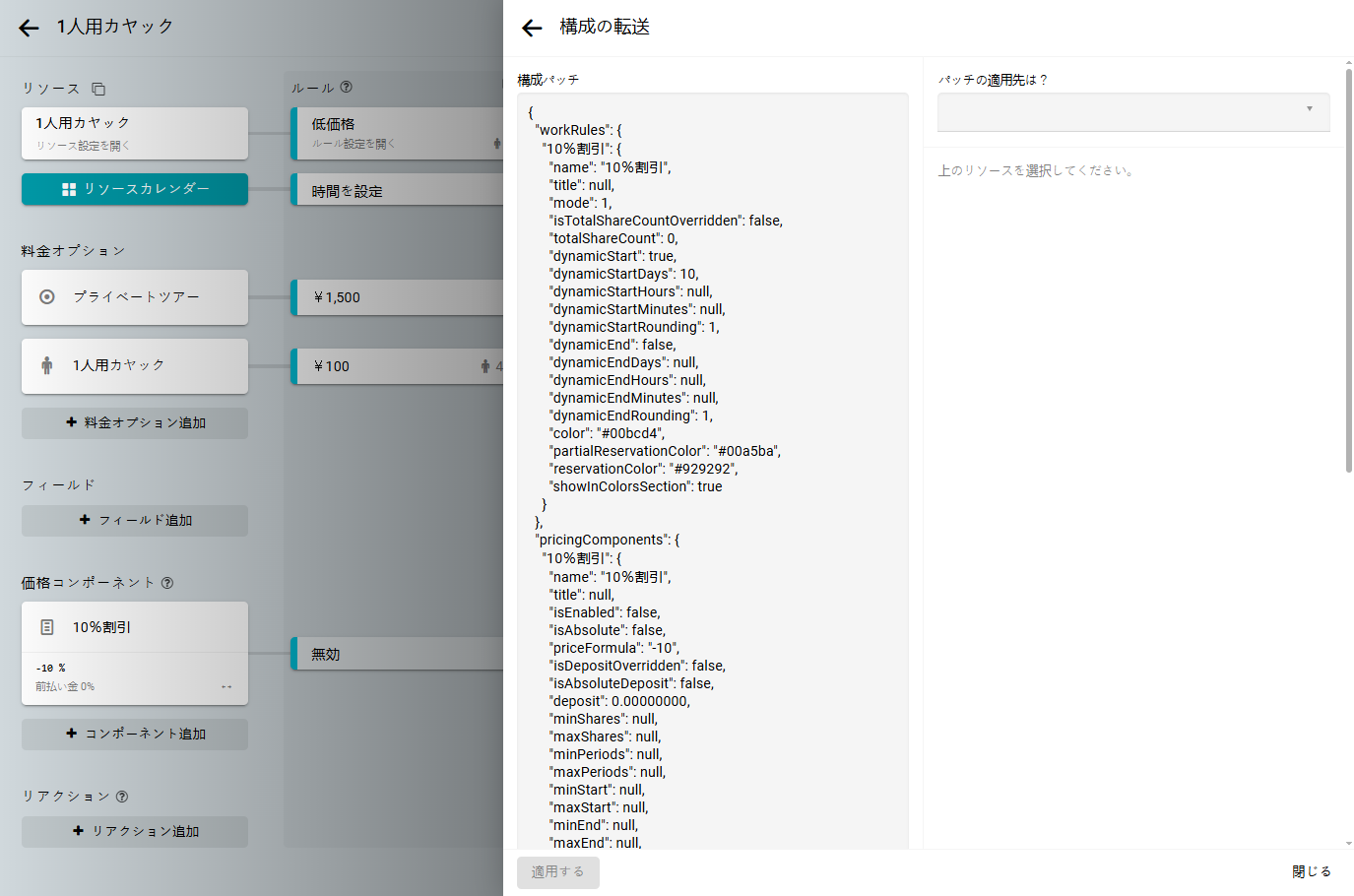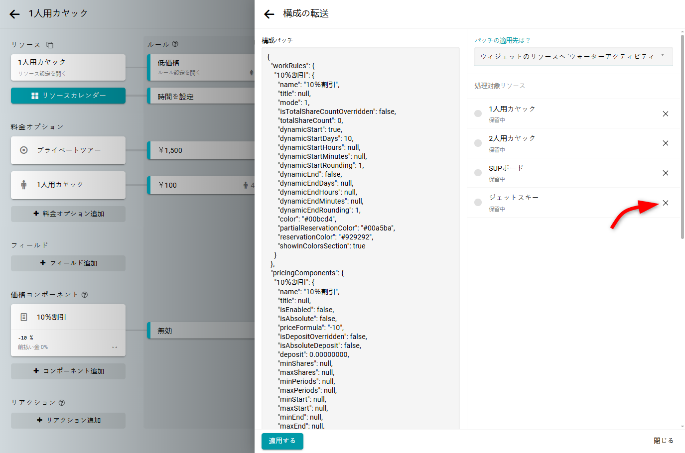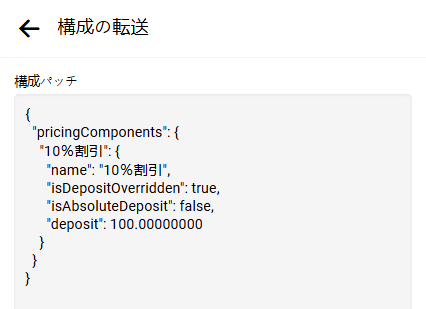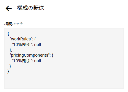 必要に応じて、構成パッチから特定の設定を削除し、リソース内で変更しないようにすることもできます。 たとえば、価格コンポーネントの前払い金設定だけを一括更新し、数式や他の設定は変更しないことが可能です。