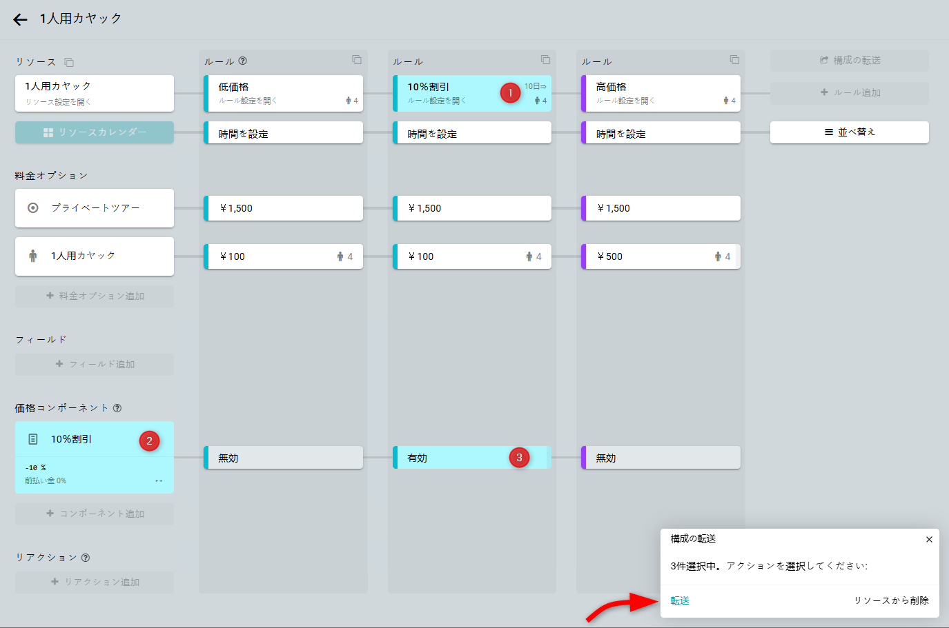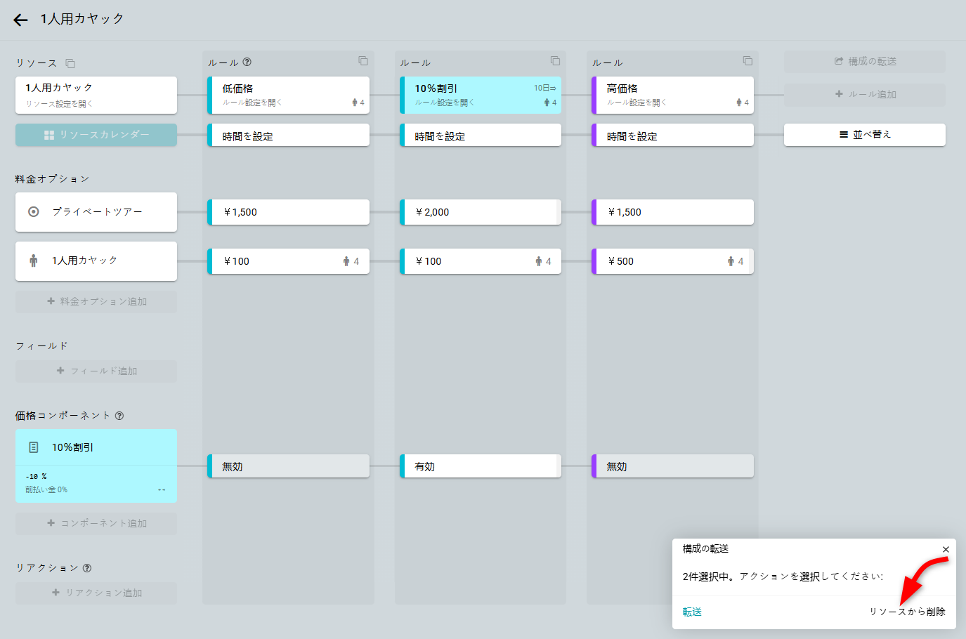 ルール、料金オプション、フィールド、価格コンポーネント、リアクションなど、あらゆる構成要素を削除できます。 また、ルールとの交差部分での要素の上書きも削除できます。 この場合、要素の設定はデフォルト値にリセットされます。