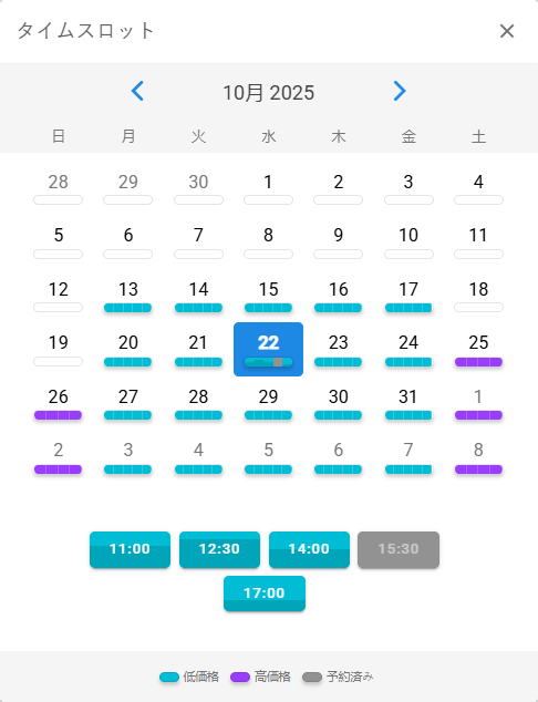 イベントは、カレンダー上にあらかじめ設定された複数の時間枠で構成されています。 クライアントはこれらの枠の中から1つを選択するだけです。 もし利用可能な枠が1つだけの場合、システムが自動的にその枠を選択します。