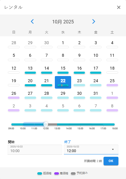 レンタルは、カレンダー上の期間を複数のステップに分割し、タイムライン上のポイントで区切られています。 クライアントは開始ポイントと終了ポイントを個別に選択します。 リソースの構成内のルールを使って、任意のカレンダーと任意のステップ構成を設定できます。