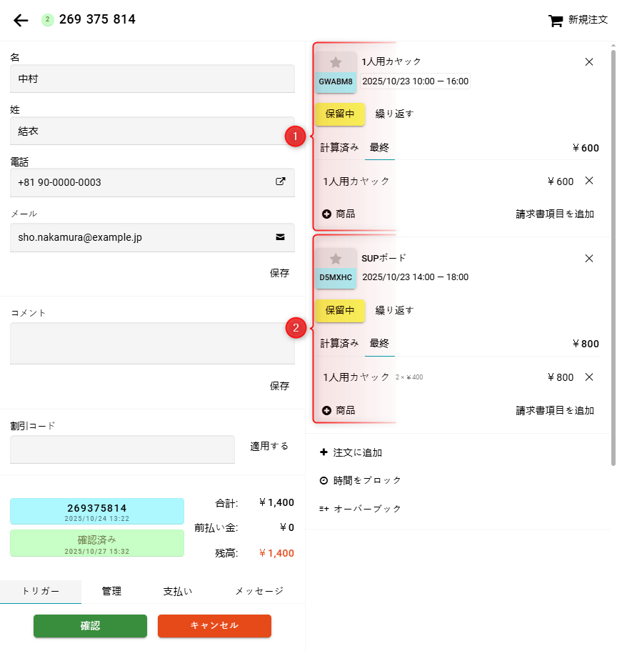 注文には、予約を行った人の情報、予約日時、支払い方法などが含まれます。注文には連絡先情報、支払い情報、確認ステータス、その他関連データが含まれます。各注文には「593235837」のような9桁のユニークな注文番号が付与されます。