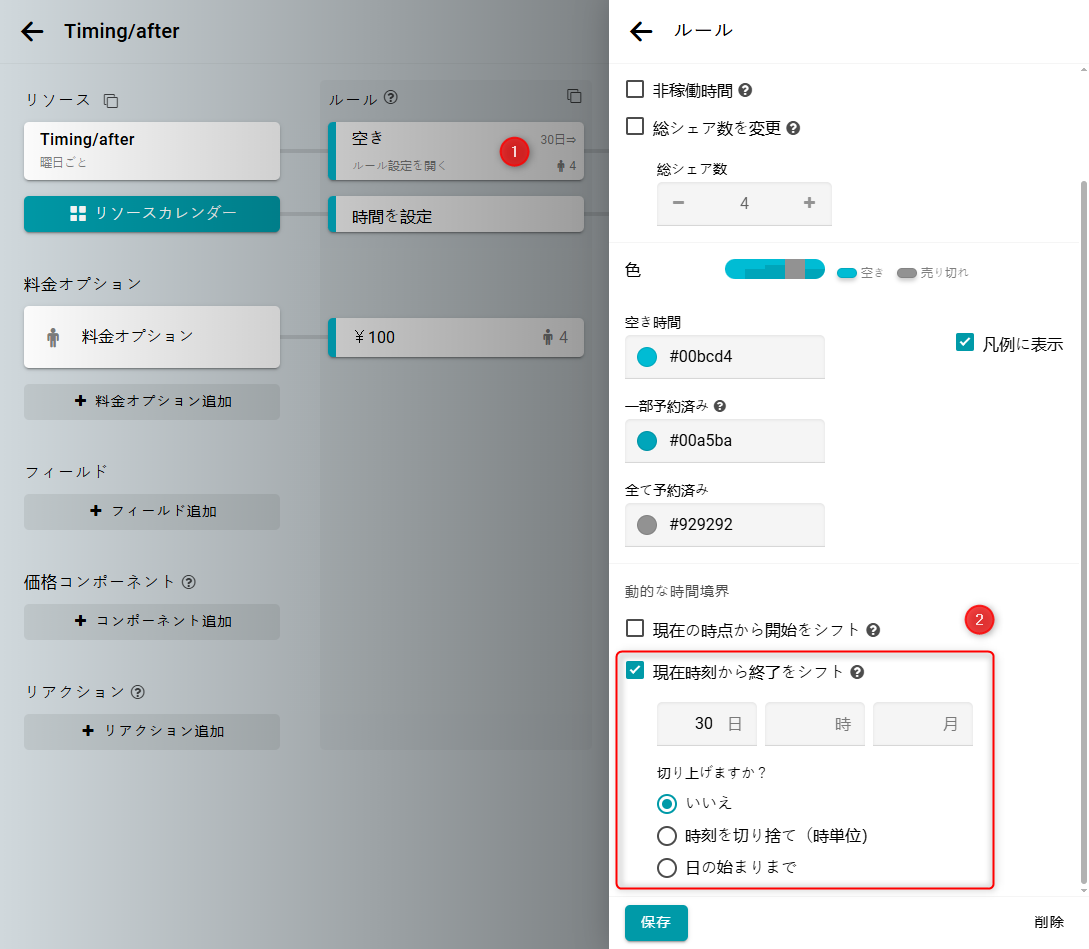 ルール設定で、現在時刻から終了をシフトのチェックボックスを選択してください。 その後、期間を30日に設定します。