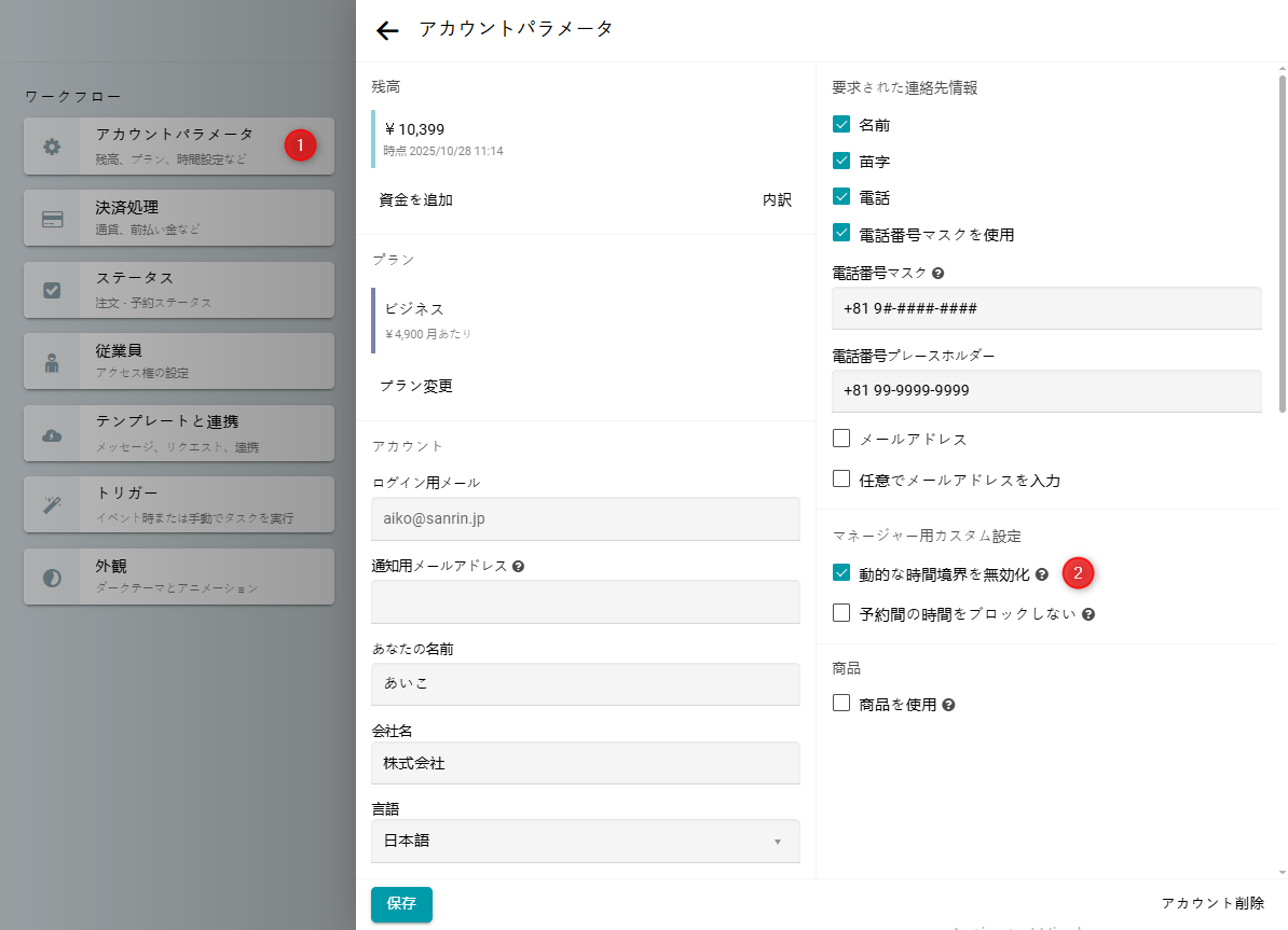 マネージャーがこれらの制限なしで予約できるようにしたい場合は、アカウントパラメータに移動してください。 動的な時間境界を無効化のチェックボックスを有効にします。