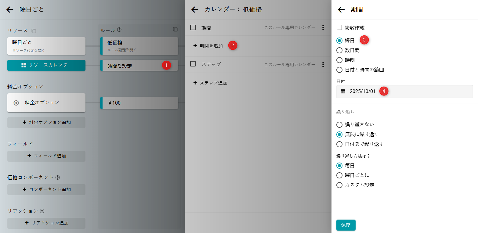 はい、対応しています。 ルールセクションで、時間を設定ボタンをクリックしてください。 次に、期間を追加をクリックするか、既存の期間を選択して編集します。 勤務時間を終日に設定してください。