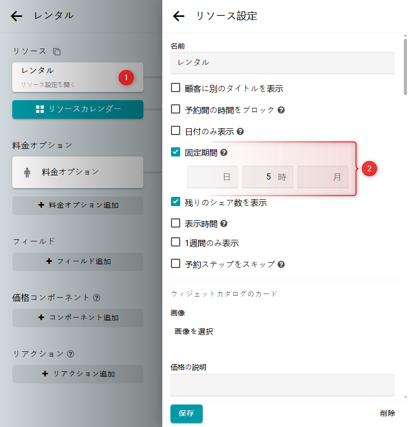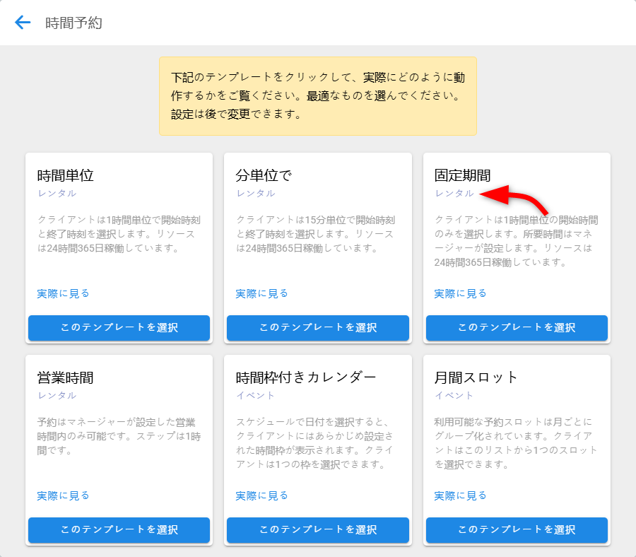固定期間のレンタルを作成してみましょう。 レンタルタイプのリソースを作成します。 テンプレートには、3時間の固定期間リソースが含まれています。