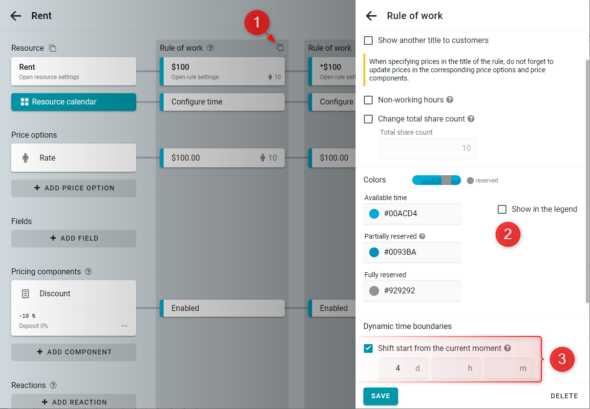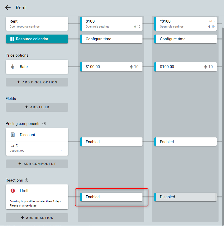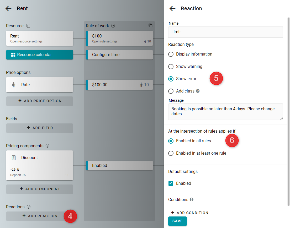 結果として、クライアントが両方のルールにまたがる時間を予約した場合、リアクションは発動しません。 しかし、元のルール内のみ(例えば現在時刻から5日目から10日目まで)を予約した場合は、エラーメッセージが表示されます。