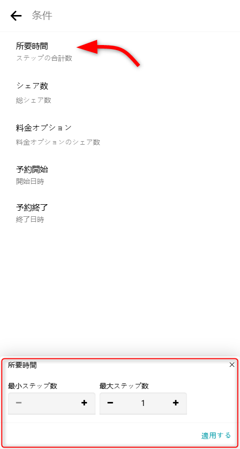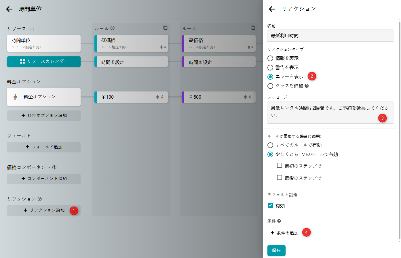 の条件を選択します。 予約が1時間以下の場合にメッセージが表示されるようにステップ数を指定します。 条件を適用し、リアクションを保存します。