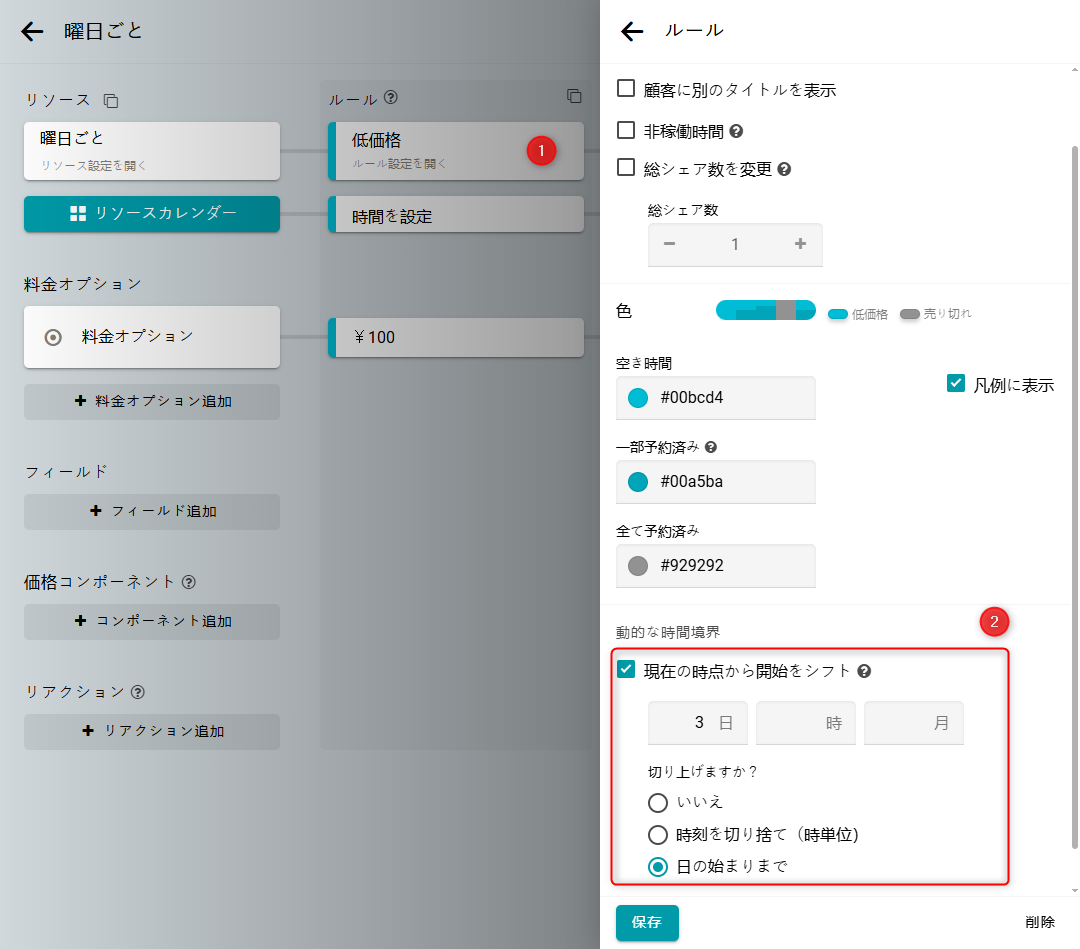 切り捨てが有効でない場合、時間は1日中連続してブロックされます。 1時間単位で時間をブロックしたい場合は、時刻を切り捨て(時単位)を選択してください。 1日全体をまとめてブロックしたい場合は、日の始まりまでを選択してください。 この場合、シフトを1日増やす必要があります。 このシナリオでは、期間を4日に設定してください。