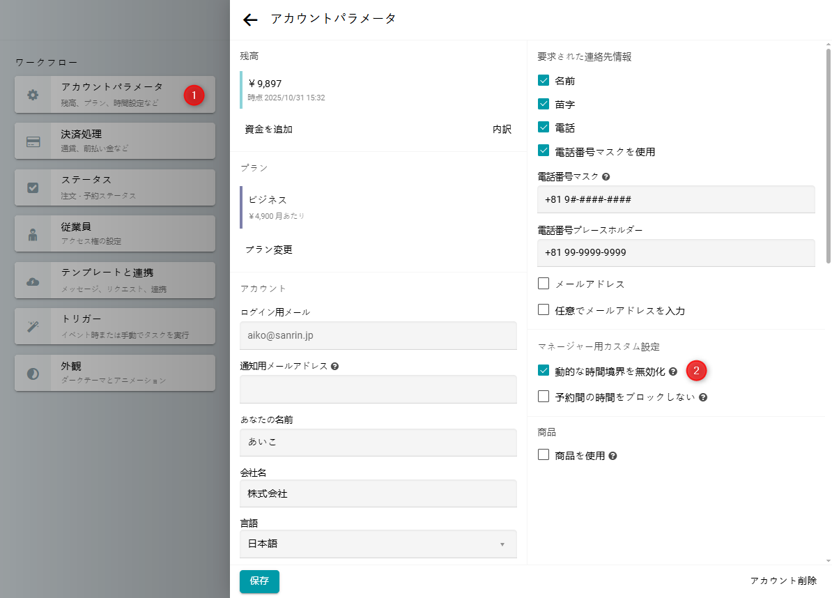 マネージャーがこれらの制限なしで予約できるようにしたい場合は、アカウントパラメータに移動してください。 動的な時間境界を無効化のチェックボックスを有効にしてください。