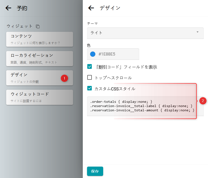合計や前払い金を非表示にするには、ウィジェット設定を開き、デザインパネルに移動します。 カスタムCSSスタイルオプションにチェックを入れ、以下のCSSを追加してください。