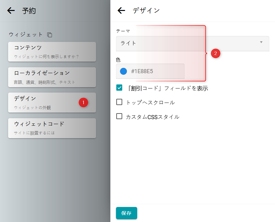 デザインパネルで、ウェブサイトのデザインに合わせてライトまたはダークのテーマを選択してください。 次に、ボタンやフォームフィールドのアクセントカラーを選びます。