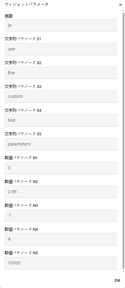 ウィジェットには最大5つの文字列パラメータ(s1, s2, s3, s4, s5)と5つの数値パラメータ(n1, n2, n3, n4, n5)を渡すことができます。